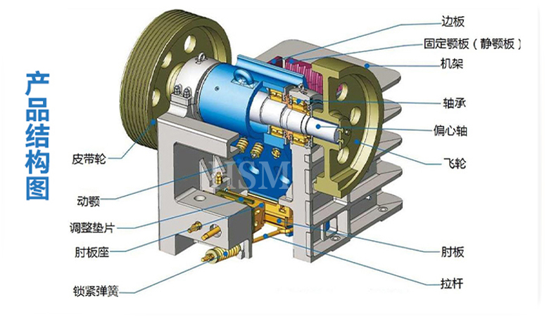 鄂式破石機(jī)破碎方式為曲動(dòng)擠壓型,電動(dòng)機(jī)驅(qū)動(dòng)皮帶和皮帶輪,通過偏心軸使動(dòng)顎上下運(yùn)動(dòng),當(dāng)動(dòng)顎上升時(shí)肘板與動(dòng)顎間夾角變大,從而推動(dòng)動(dòng)顎板向固定顎板接近,與其同時(shí)物料被壓碎或劈碎,達(dá)到破碎的目的;